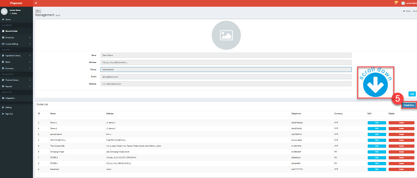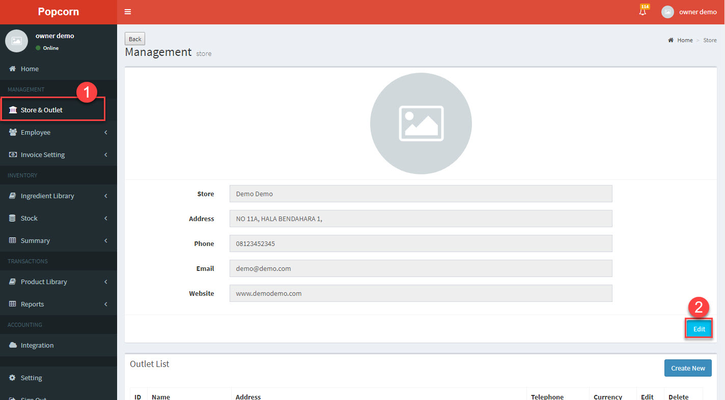 1.Once enter, click on Store and Outlet -> 2.Click Edit to maintain Store (HQ) information