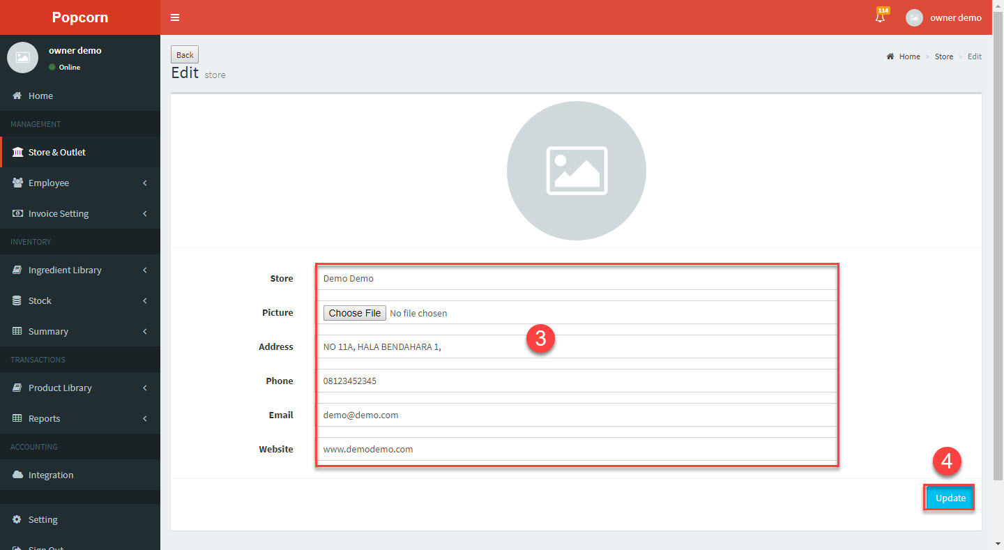 3.Enter / Update the Store (HQ) information -> 4.Click Update