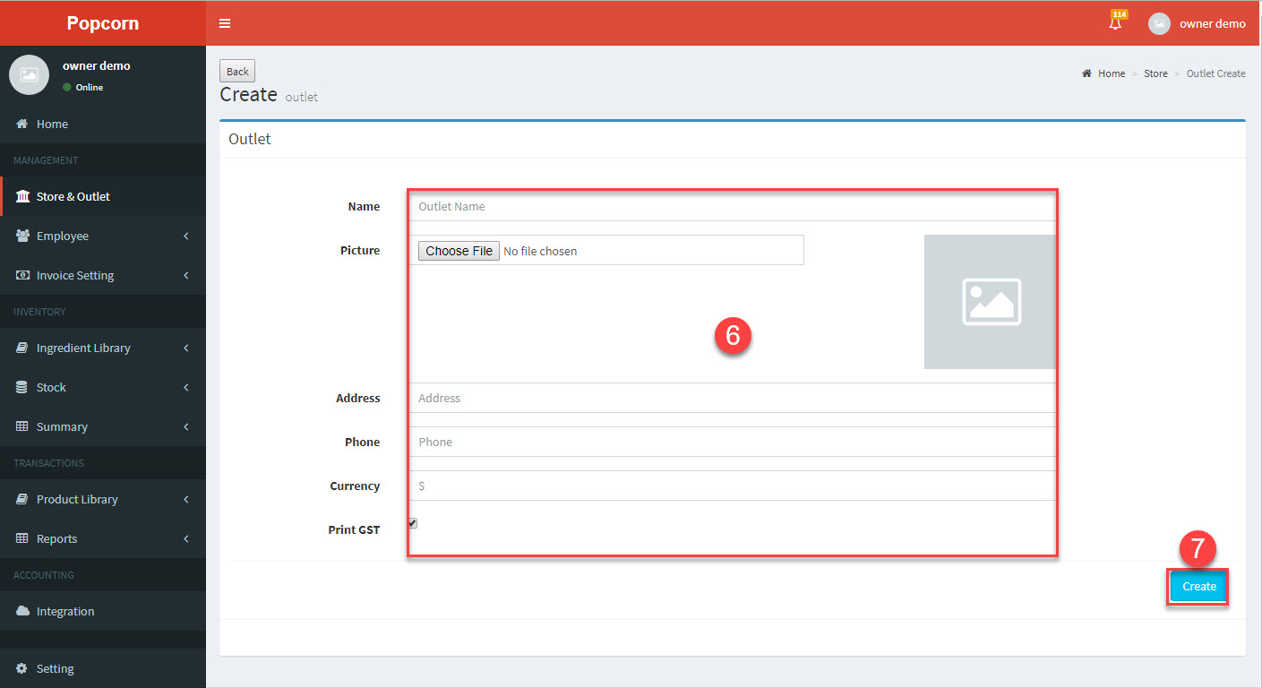 6.Enter new outlet information -> 7.Click Create