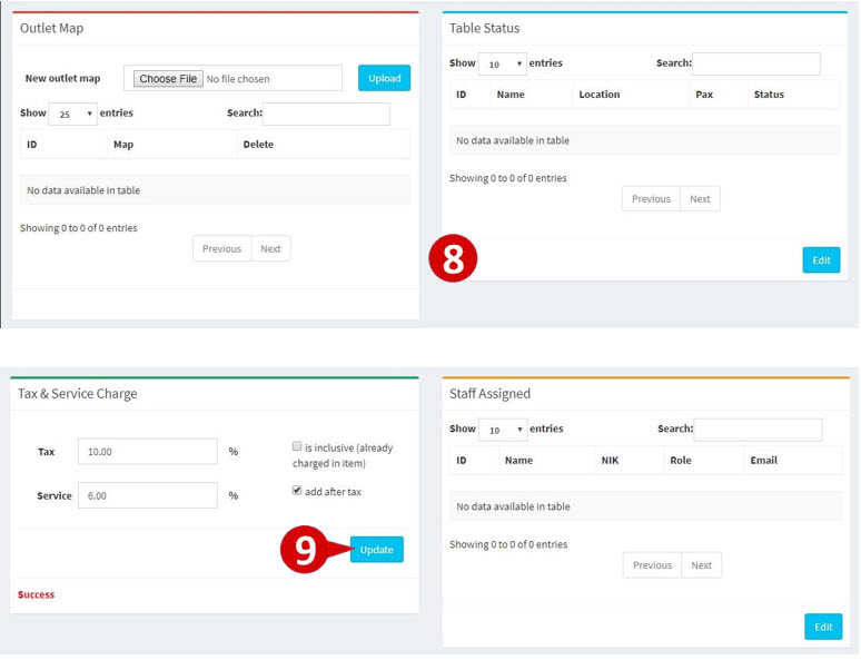 8.User able to upload location map and view table status -> 9.Set Tax and Service Charge percentage, click Update